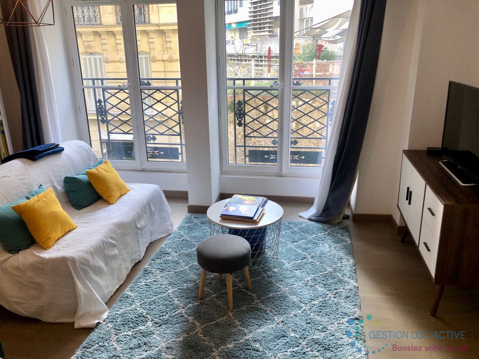 L'appartement se compose d'un grand séjour avec cuisine ouverte, d'une chambre, d'une salle de bain et d'un WC séparé. La cuisine bénéficie de plaques inductions, d'un four, d'une hotte aspirante. La machine à laver est dans la salle de bain et le canapé dans le salon est convertible.