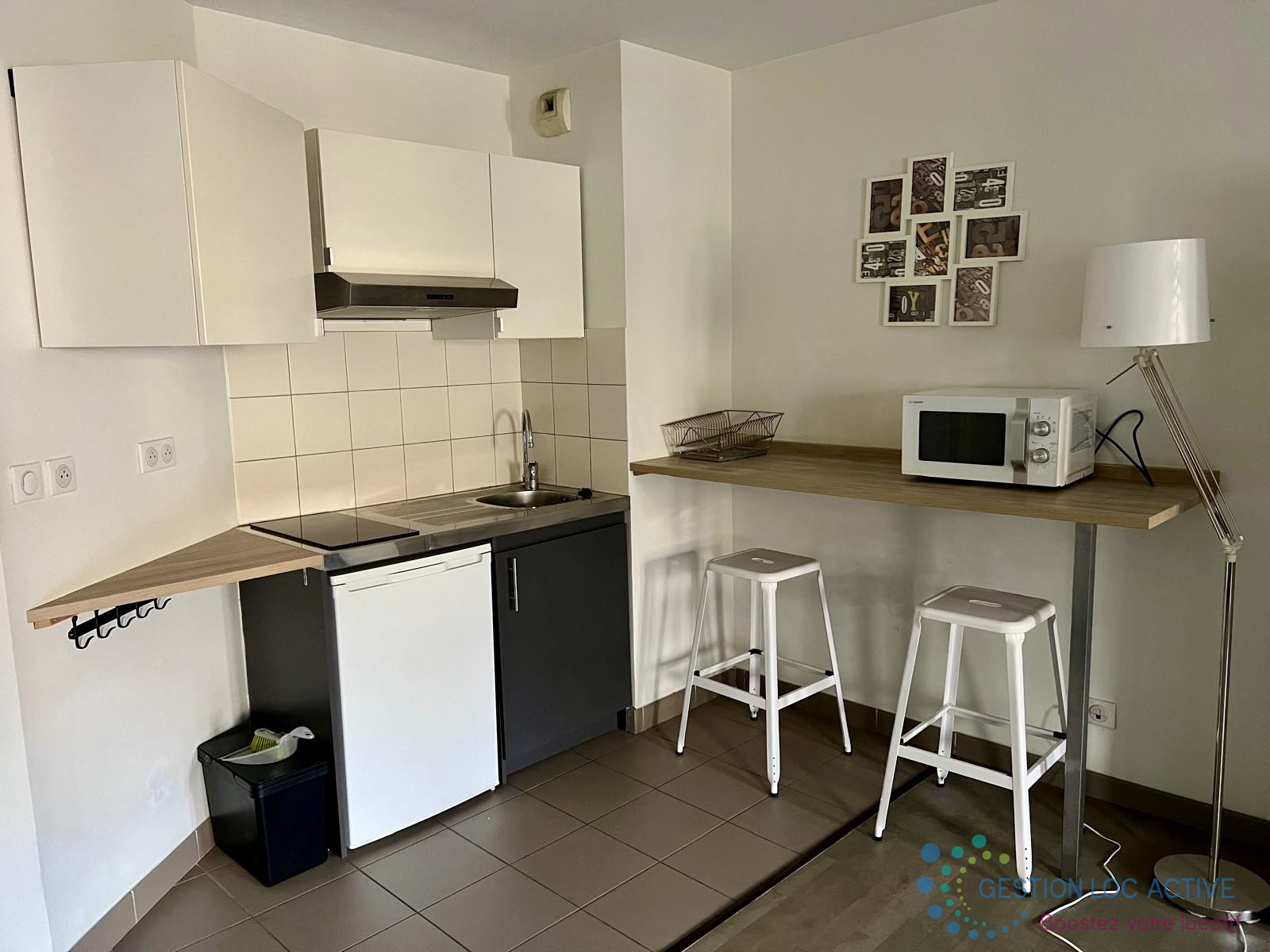 Dans un petit immeuble calme et rénové, ce studio de 30 m² se compose d'une grande pièce à vivre comprenant un espace cuisine équipé d'une plaque de cuisson d'une hotte, d'un frigo et d'un micro-onde.