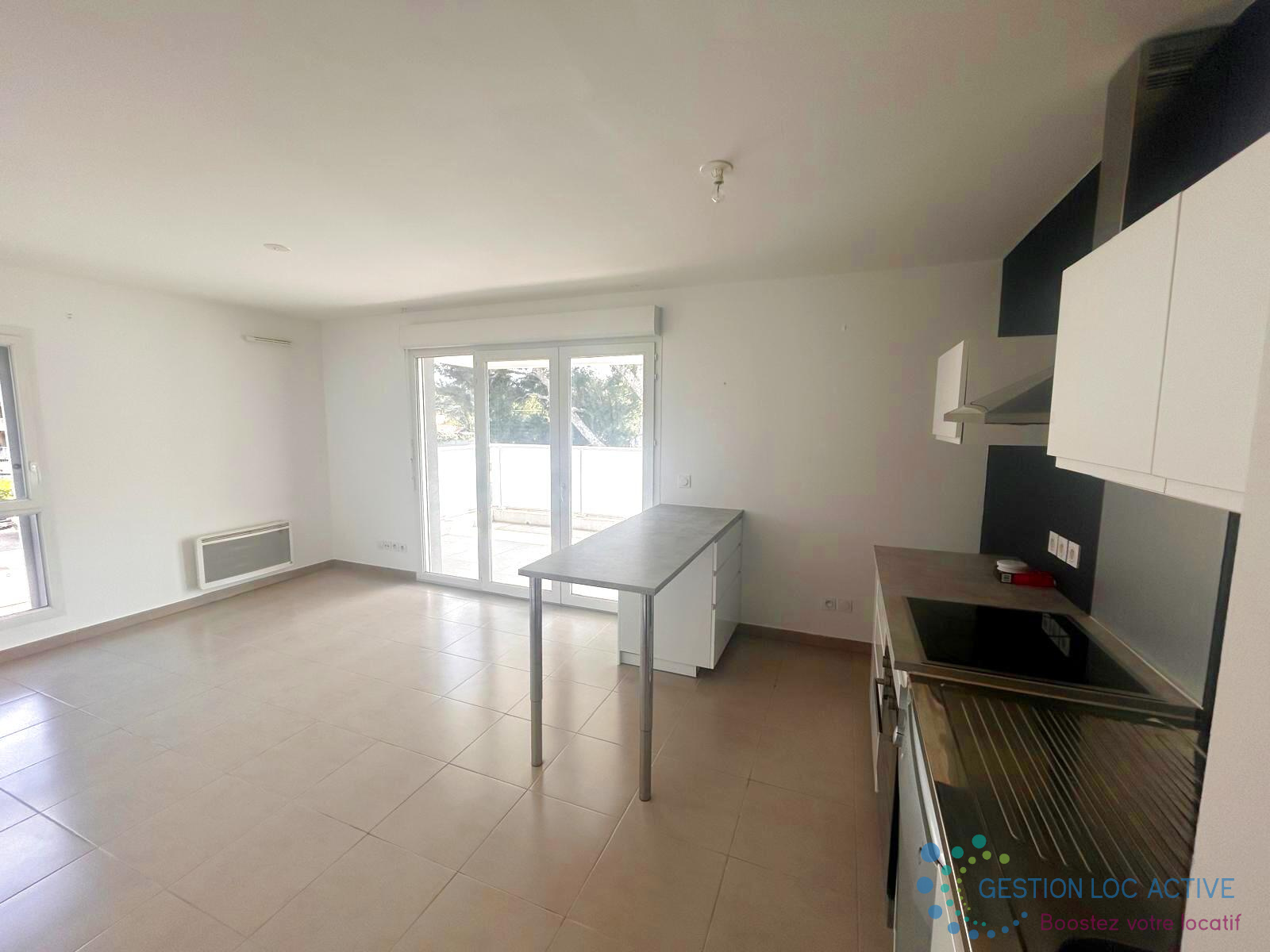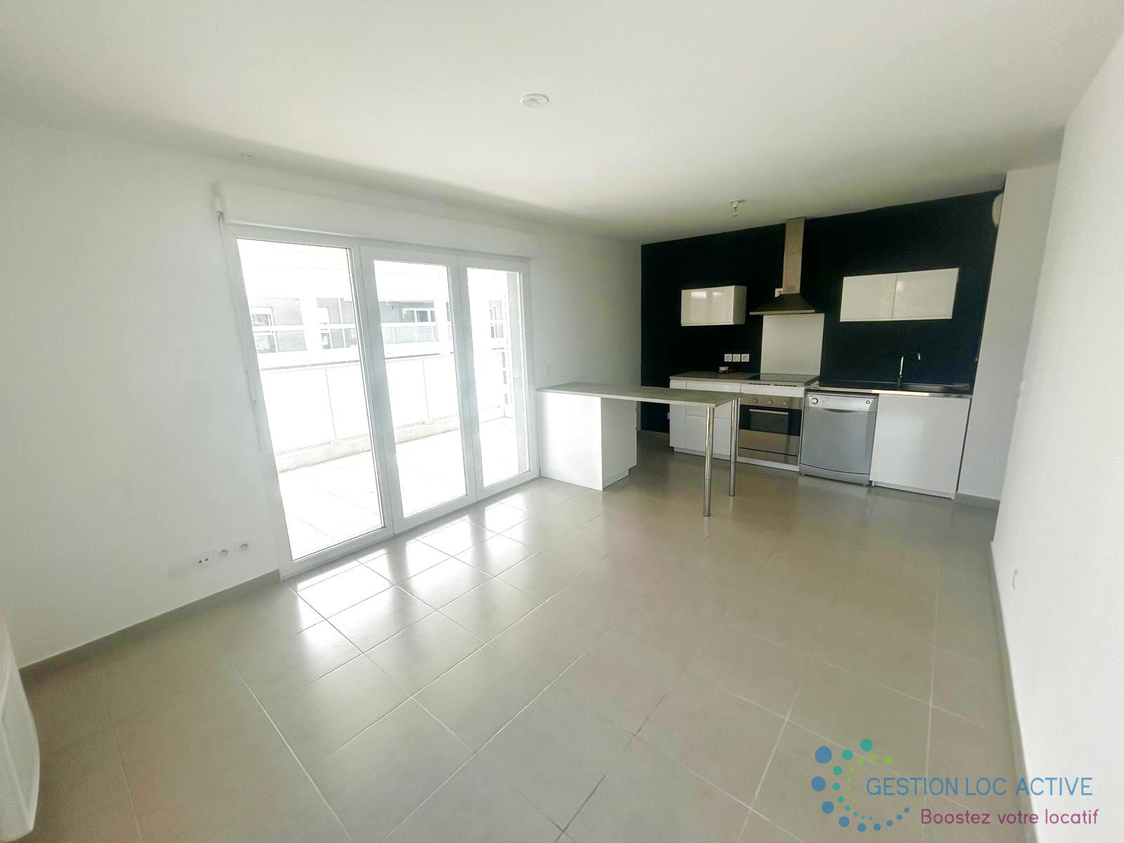 Il se compose d'un grand salon avec cuisine ouverte et équipée (hotte, four, plaque de cuisson 4feux et lave vaiselle) donnant sur une terrasse, un couloir menant à deux chambres, à une salle de bains et à un WC séparé. Immeuble raccordé à la fibre optique.
