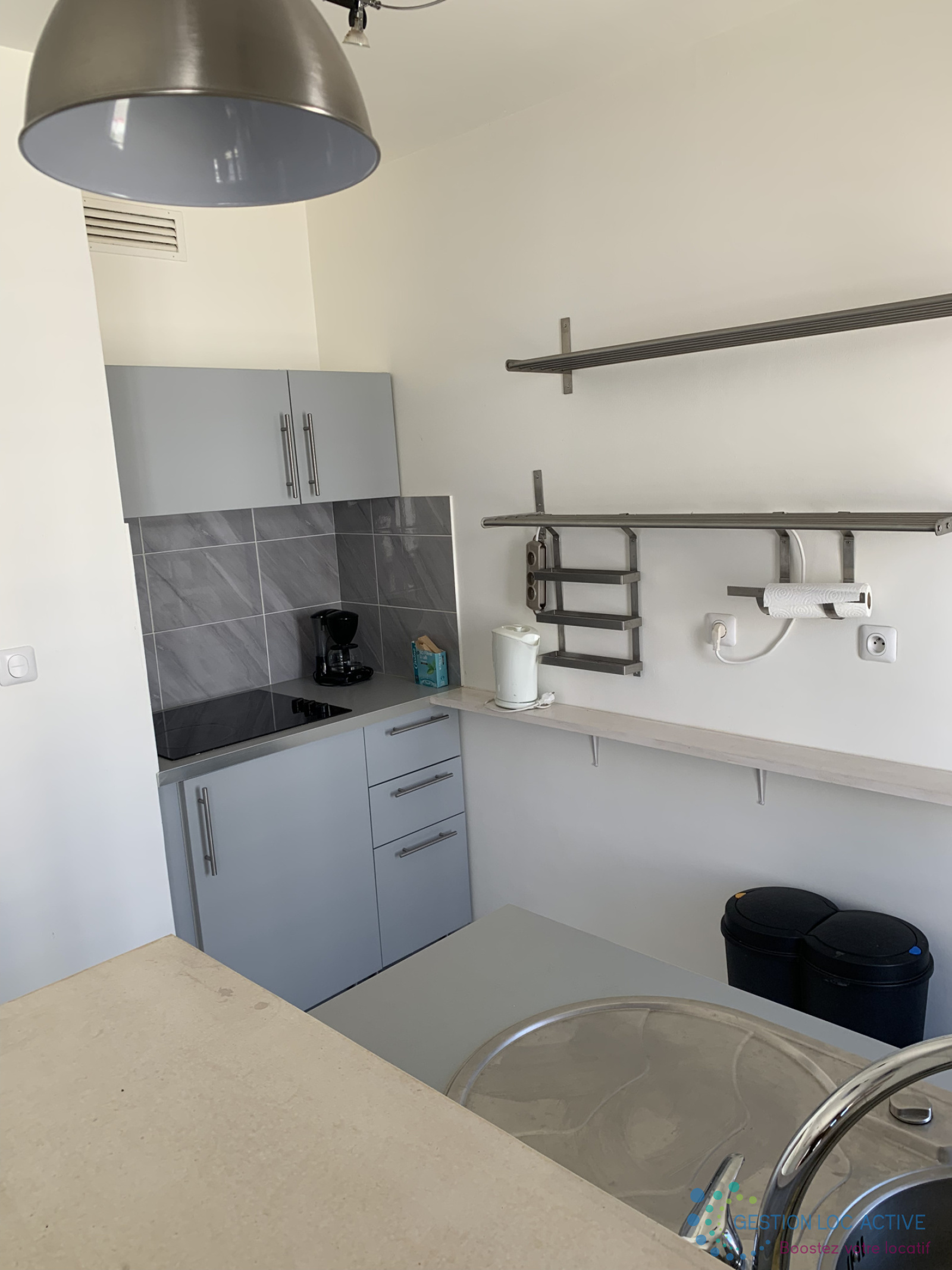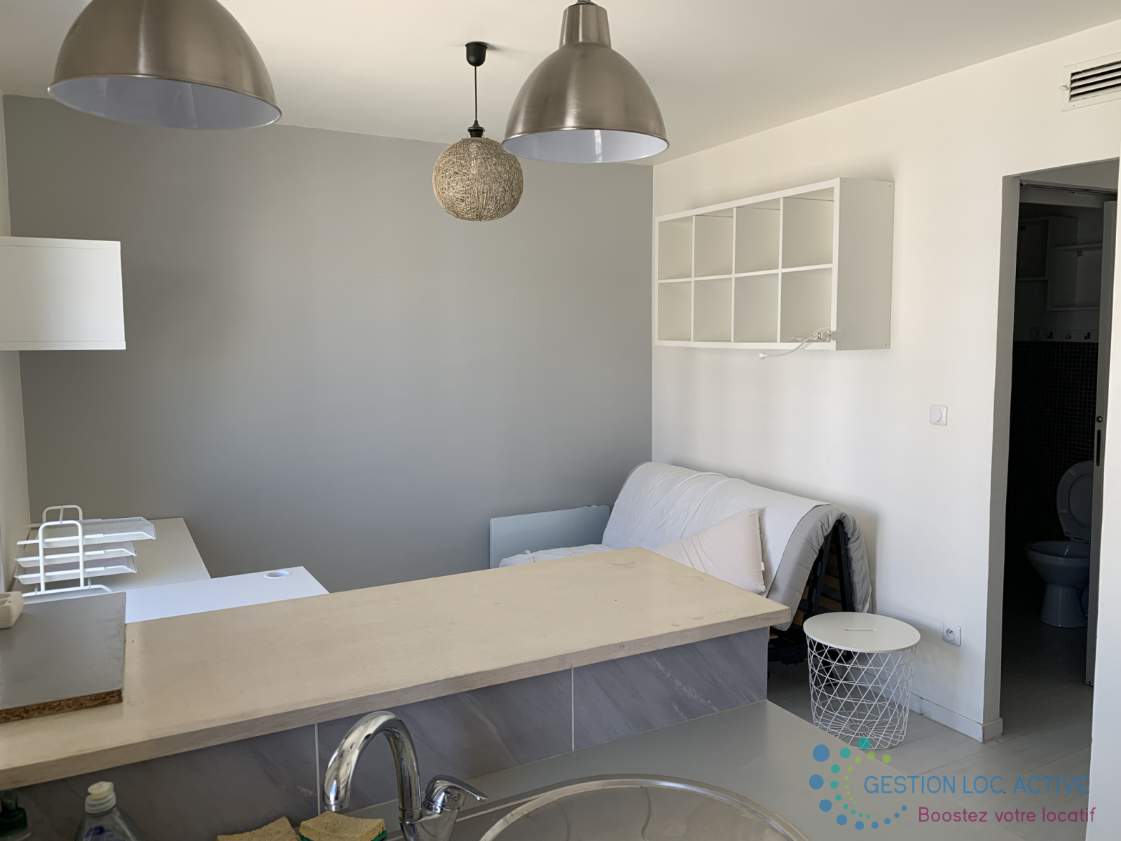 Une cuisine équipée d'une plaque de cuisson et d'un micro-onde, ainsi qu'une pièce de vie avec un canapé-lit et un bureau et pour finir nous vous proposons une salle d'eau de 4,05m² avec WC et une machine à laver.