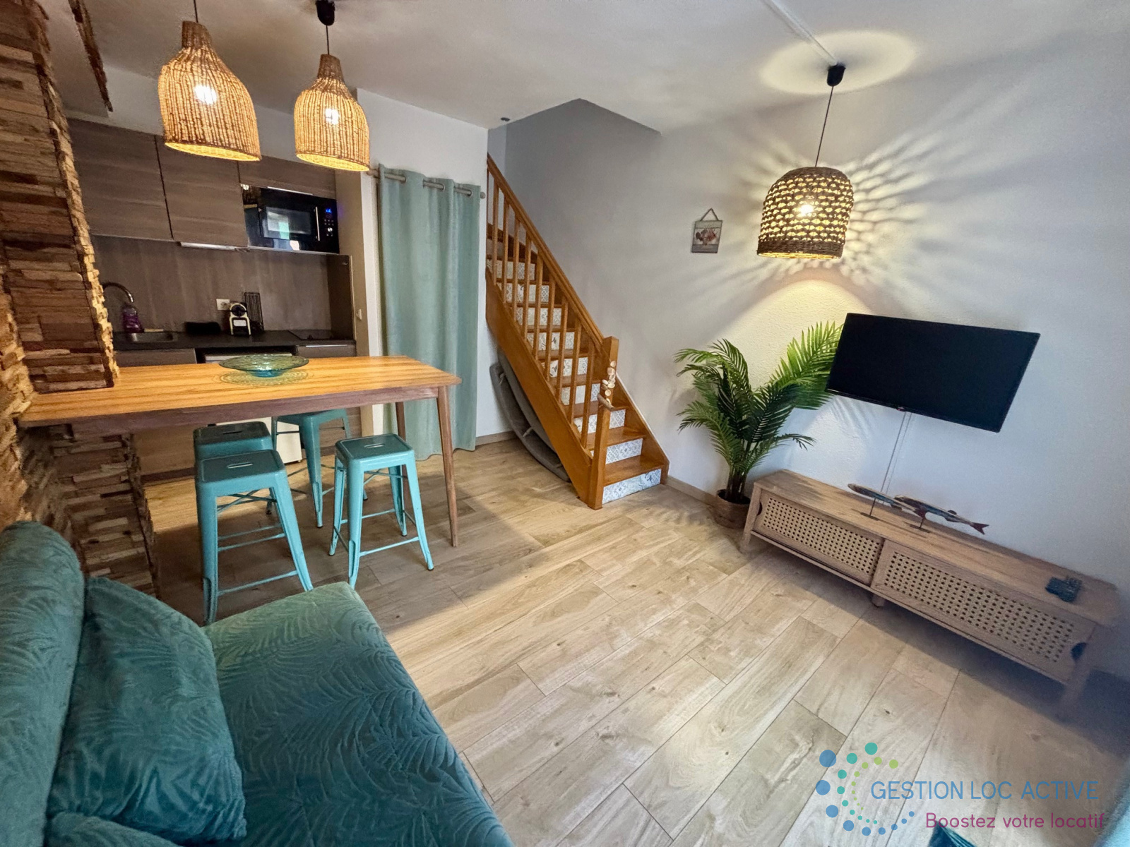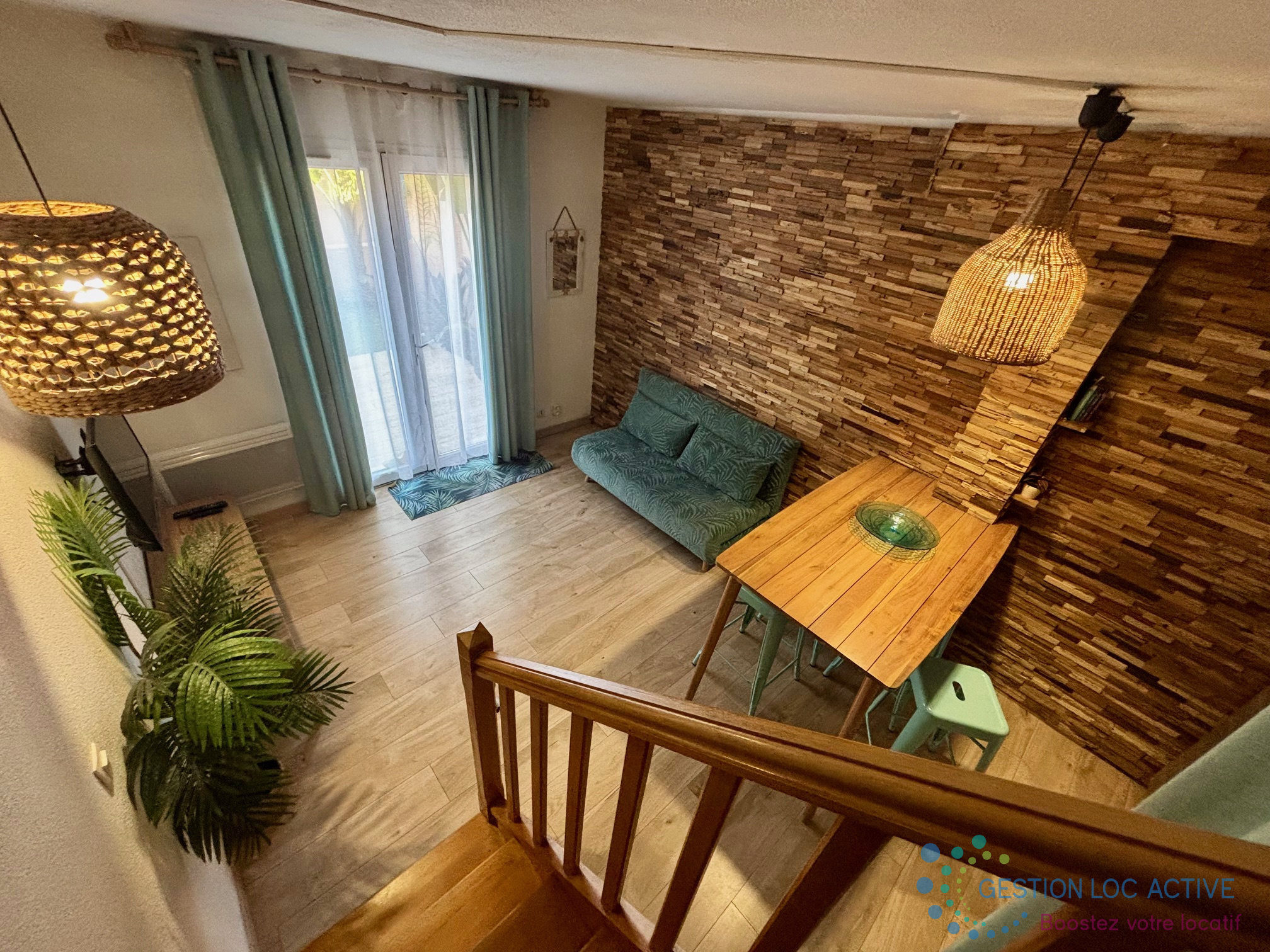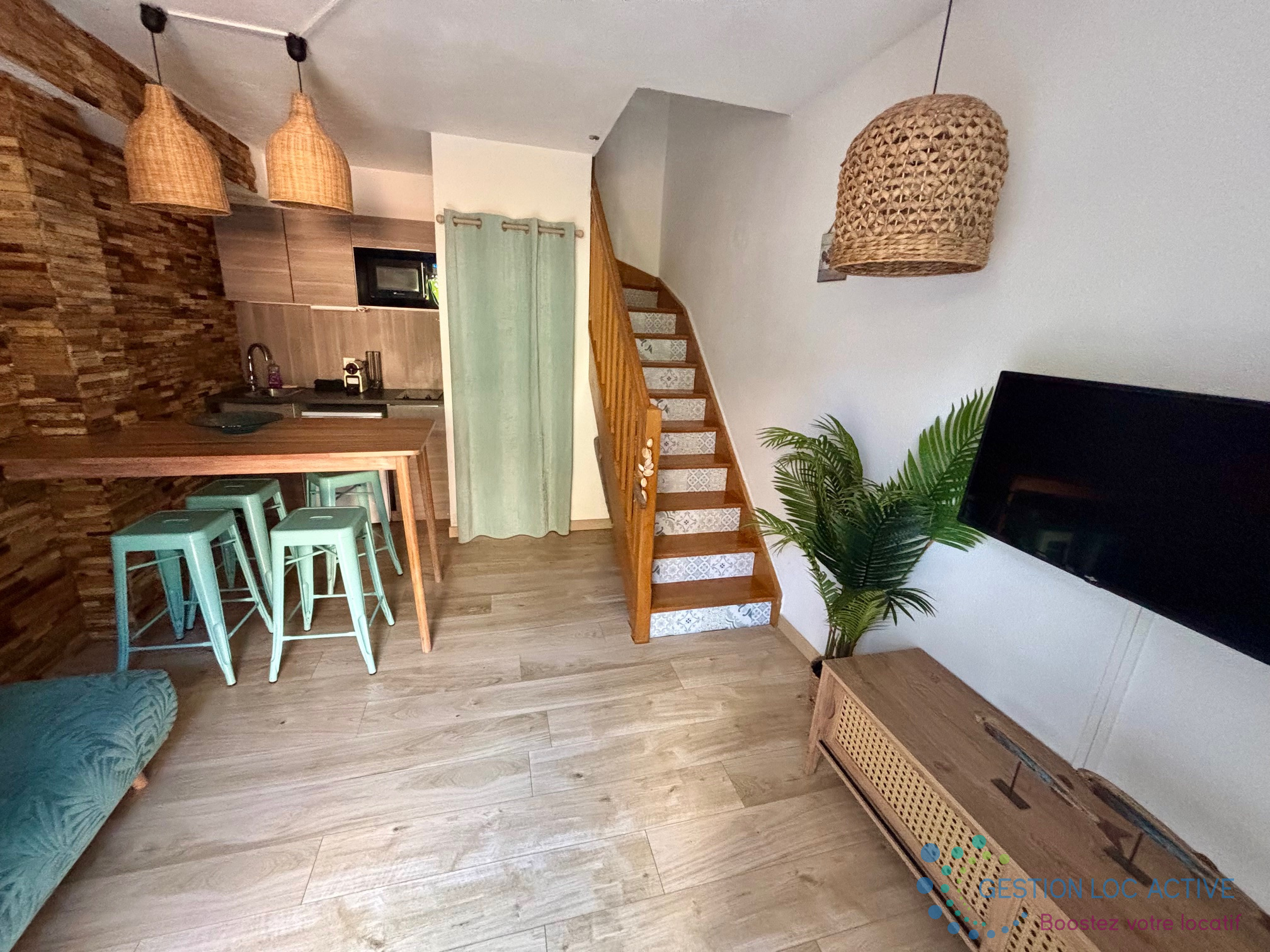 Entièrement rénové en 2020, le logement se compose, au rez-de-chaussée, d’une pièce de vie avec salon et cuisine aménagée et équipée (plaque de cuisson, réfrigérateur, micro ondes, lave-linge) ouvrant sur un jardin privatif de 15,30 m² avec terrasse.